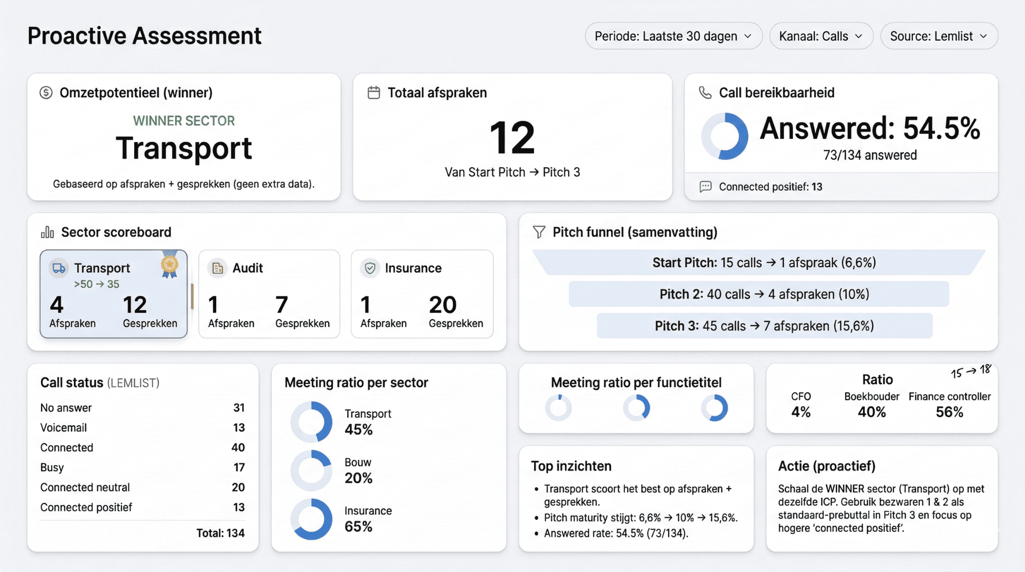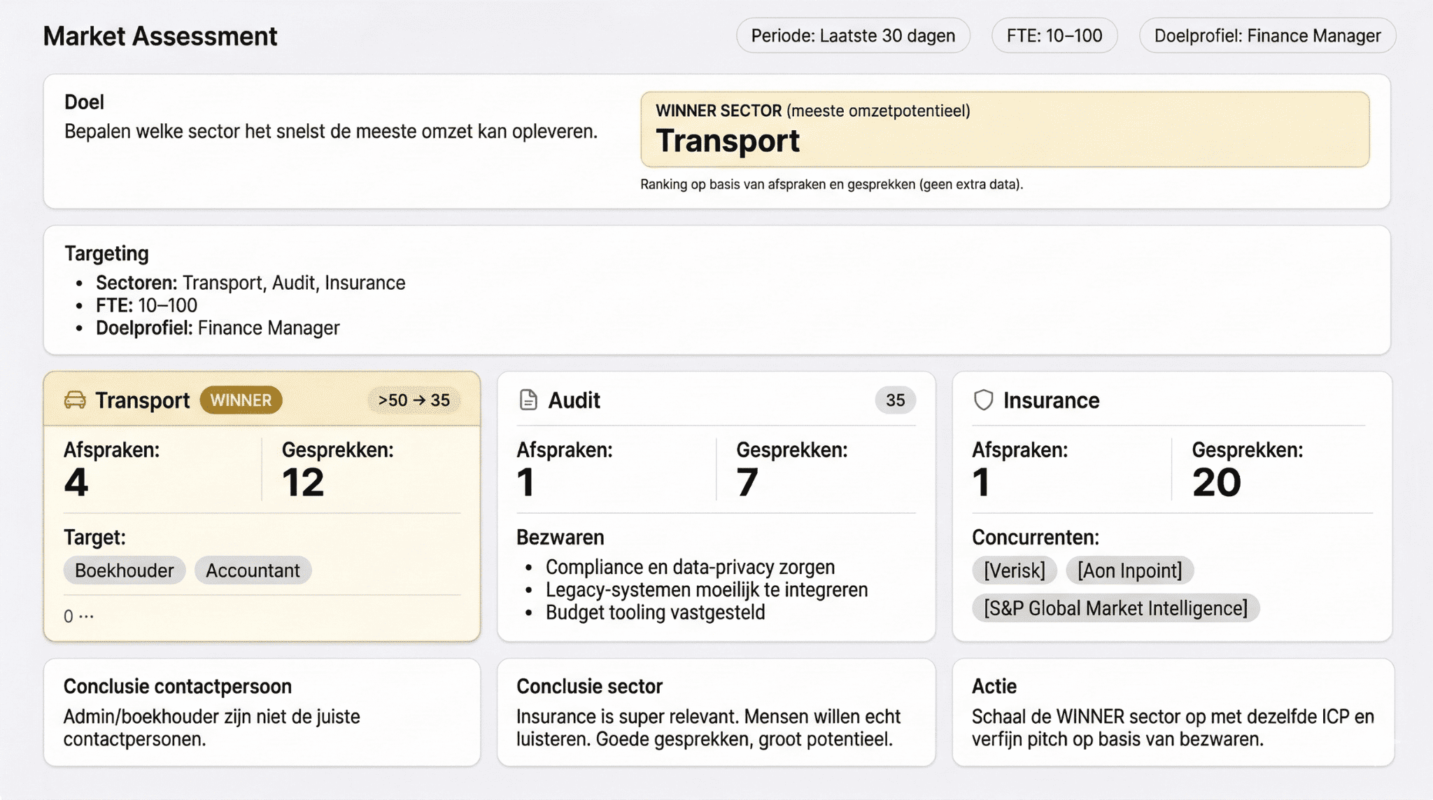 Geen theoretische cases, maar echte commerciële vraagstukken die we in de markt valideren via prospectie, gesprekken en data.